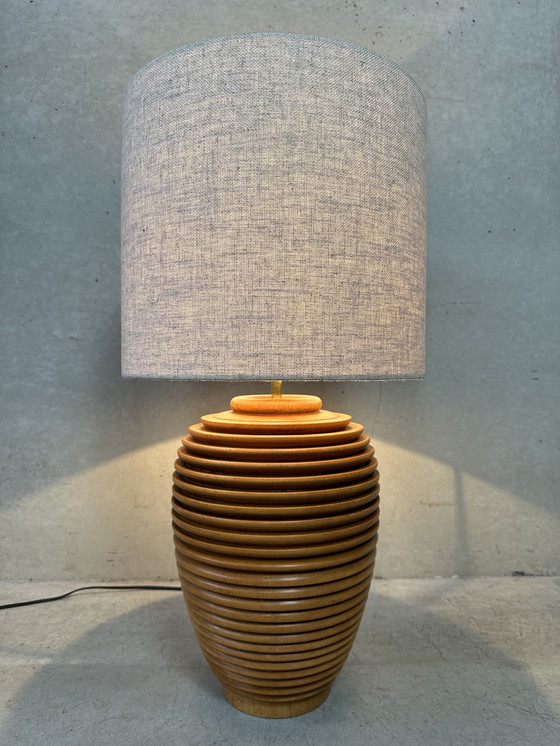 Lampada vintage con base in legno scanalato. Dotata di un nuovo paralume cilindrico a tamburo in lino naturale beige. Attacco E27. Effetto bello e caldo. Altezza: 67 cm. Diametro paralume: 35 cm. Peso: 3,6 kg.