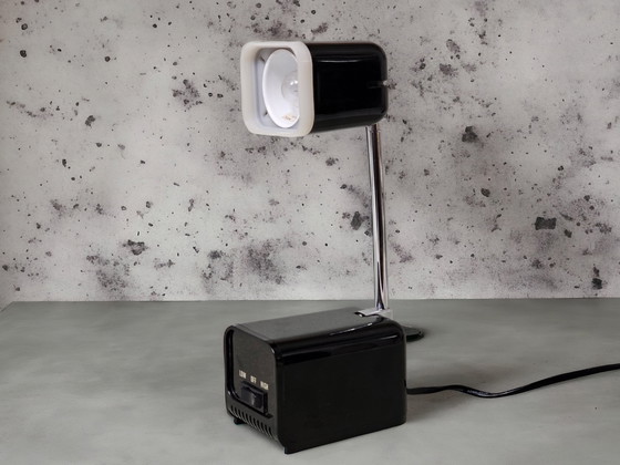 In vendita una leggendaria lampada da tavolo dal design Space Age con asta telescopica e doppio snodo. Il corpo è in plastica nera. Un interruttore sulla base offre due livelli di luminosità.