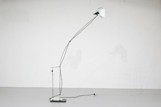 Questa lampada originale e rara è composta da una base in metallo laccato nero che sostiene aste cromate flessibili che formano un arco.