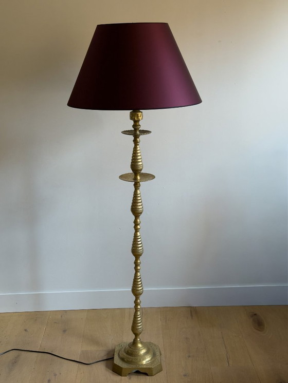 Elegante lampada da terra in stile arabo realizzata in rame con una calda finitura color oro. La lampada presenta intricate decorazioni in bronzo, che mettono in risalto splendidi dettagli tradizionali e un carattere raffinato ed esotico. È dotata di un paralume perfettamente abbinato che completa la base riccamente decorata.