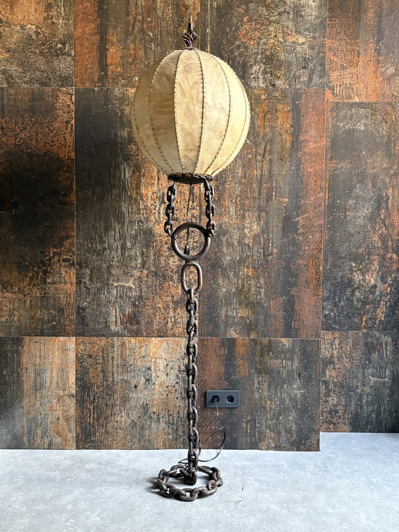 Questa esclusiva lampada da terra brutalista XL è davvero speciale. Probabilmente unica nel suo genere. Osservate i dettagli nella base della lampada e lo spessore della catena. Il paralume rotondo crea un'atmosfera meravigliosamente calda. Un vero pezzo forte per la vostra casa. Altezza: 190 cm. Diametro del paralume: 50 cm.