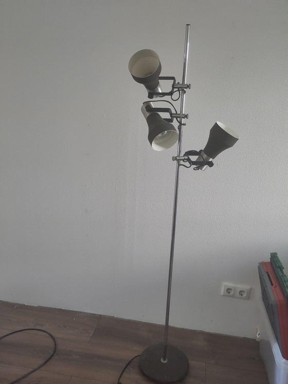 Lampada da terra vintage in ottone con paralumi in vetro a forma di fiore: suggestiva ed elegante Descrizione Bellissima lampada da terra vintage con un'elegante base in ottone e tre paralumi in vetro a forma di fiore. La lampada è un vero colpo d'occhio: classica nello stile, ma perfettamente adatta a un interno moderno o eclettico. I paralumi in vetro emanano una luce calda e suggestiva e sono splendidamente lavorati. La lampada funziona perfettamente ed è adatta a lampadine con attacco piccolo (E14). Grazie al suo design sottile, occupa poco spazio, ma aggiunge immediatamente carattere alla stanza. Dettagli - Altezza: circa 160 cm - Materiale: ottone (metallo) e vetro - Attacchi: 3x E14 (lampadine non incluse) - Condizioni: in ottime condizioni vintage, minime tracce d'uso commisurate all'età - Funziona perfettamente come dovrebbe