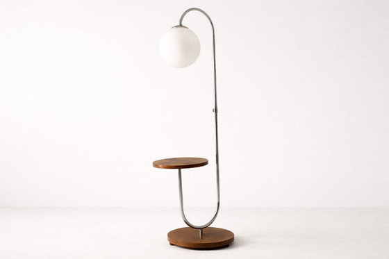 La struttura è realizzata in tubolare d'acciaio cromato, si erge da una base circolare in legno impiallacciato e si estende in un braccio arcuato. Sostiene un paralume sferico in vetro opalino e incorpora un tavolino rotondo. Il pezzo si presenta in buone condizioni originali, con patina sulla cromatura e segni di usura visibili sugli elementi in legno.