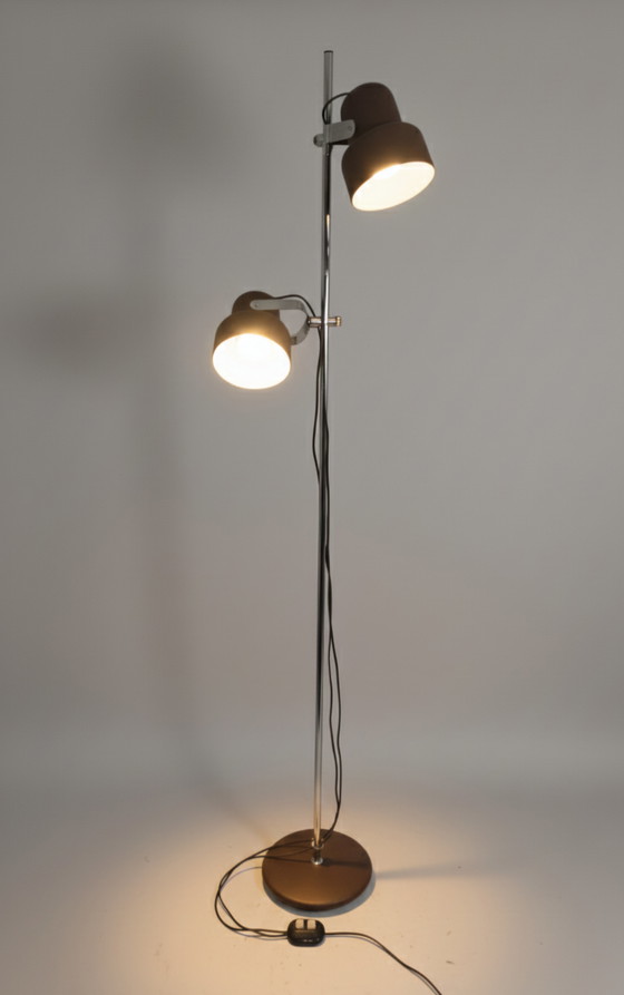 Questa lampada da terra vintage (anni '60) di Philips è un vero e proprio colpo d'occhio per i vostri interni. Con la sua elegante finitura marrone e argento, aggiunge un tocco di fascino retrò a qualsiasi stanza. Perfetta per creare un'atmosfera accogliente in soggiorno o studio.