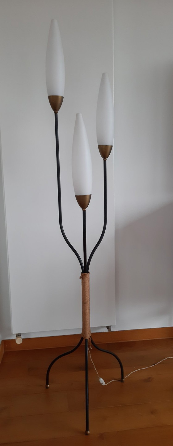Lampada da terra francese vintage con treppiede in opalino, anni '50