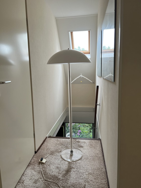 "Questa lampada da terra vintage Harco Loor è un'aggiunta elegante a qualsiasi ambiente. Caratterizzata da un'elegante struttura in metallo e plastica, offre un design moderno ma senza tempo. La base trasparente e il paralume bianco della lampada creano un look pulito ed elegante, perfetto per valorizzare l'arredamento. Ideale per fornire un'illuminazione d'ambiente, questa lampada da terra è sia funzionale che decorativa".