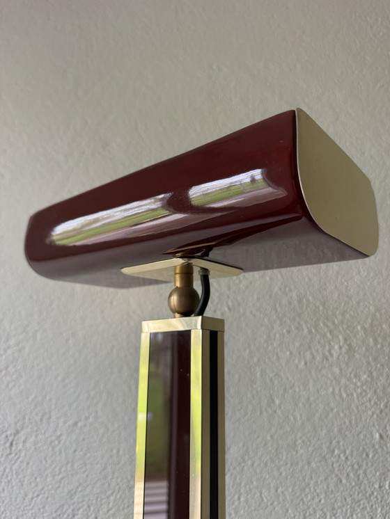 Bellissima lampada da terra alogena degli anni '70/'80 di Kott (Parigi), metallo laccato bordeaux, ottone dorato e diffusore in ceramica bordeaux; ottime condizioni generali (qualche lieve traccia del tempo) Altezza: 185 cm Larghezza base: 22,6 cm Lunghezza diffusore: 25 cm Profondità: 13,5 cm