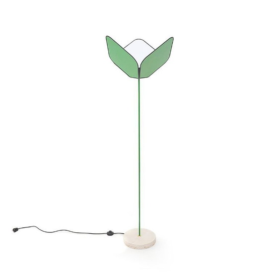 Lo stelo sottile esalta la verticalità della lampada, mentre la base circolare in travertino introduce una presenza materica solida e naturale che bilancia la leggerezza visiva della parte superiore. Il contrasto tra metallo laccato e pietra riflette un approccio progettuale distintamente italiano, attento sia alla funzionalità che alla qualità scultorea.