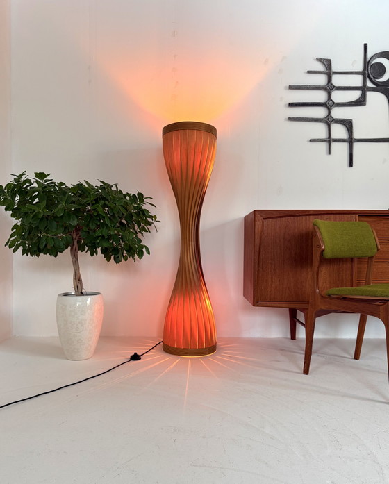 Splendida lampada da terra a forma di clessidra con due lampadine (attacco E27 standard). Le lampadine emettono una luce soffusa attraverso i listelli in impiallacciatura di pino.