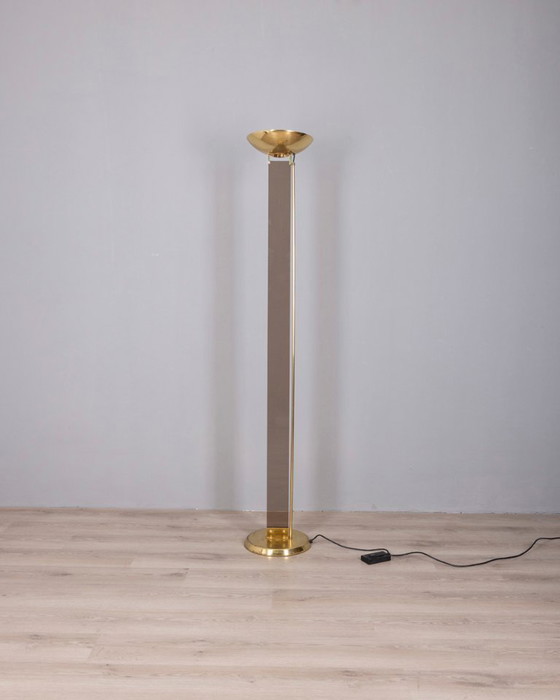 Lampada da terra con struttura in ottone dorato e vetro fumé, disegnata da Relux Milano, anni '80.