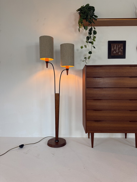 Che bellezza, questa splendida lampada da terra. Una base in teak pesante. Splendida finitura arrotondata, calda tonalità teak e venature del legno visibili.