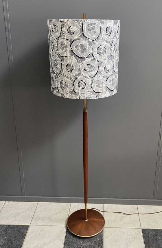 Lampada da terra vintage in teak con paralume stampato a ciambella