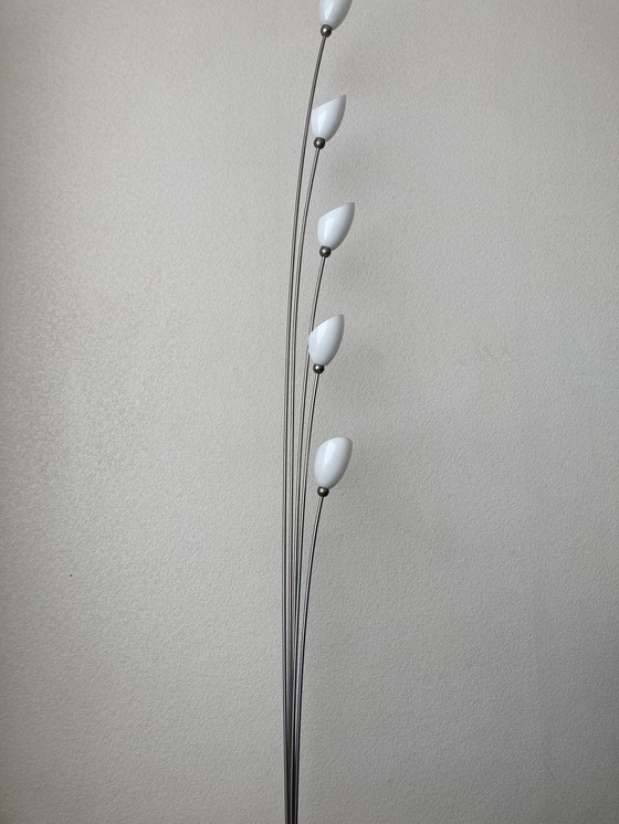 Splendida e sottile lampada da terra di Harco Loor. Il modello Wings risale agli anni '90. La lampada ha cinque sorgenti luminose, che le conferiscono un aspetto discreto e sobrio. Il suo design sottile la rende perfetta per un angolo o un piccolo soggiorno. La lampada è dimmerabile.