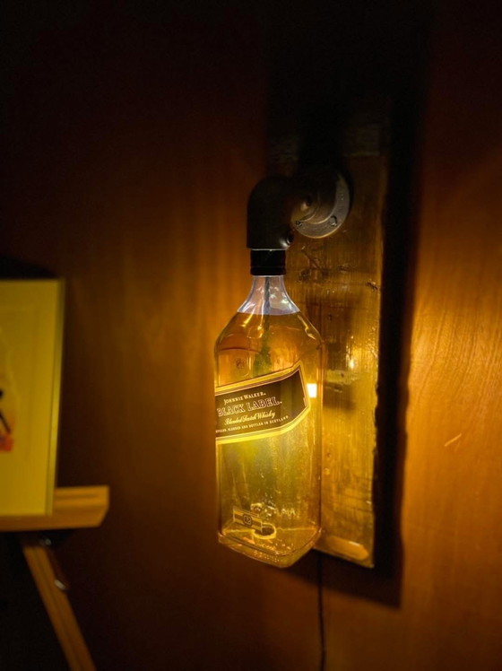Lampada d'atmosfera unica, realizzata con una bottiglia di whisky Johnnie Walker Black Label demo (plastica), combinata con un tubo da impalcatura e una base in legno da impalcatura. Questa lampada da parete industriale aggiunge un aspetto caldo, robusto e distintivo a qualsiasi ambiente. Perfetta per gli amanti dell'upcycling e dei pezzi decorativi unici.