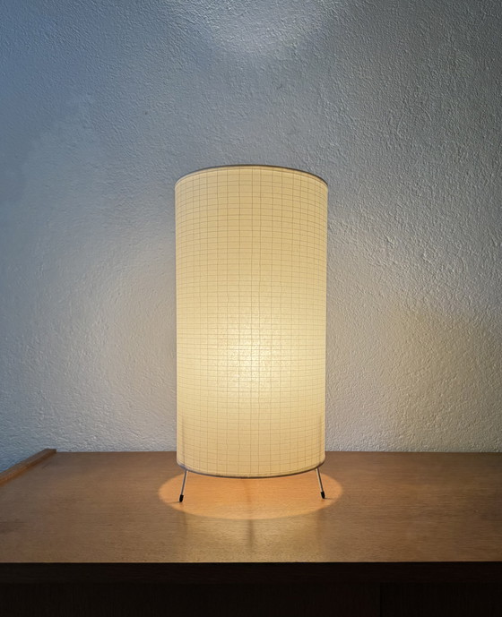 Attraente lampada cilindrica in carta di ispirazione scandinava realizzata da SCE (Société Centrale d'Eclairage, Francia) per Habitat, anni '80-'90; struttura in ottime condizioni (2 macchie marroni poco visibili nell'uso: vedi foto), per lampadina a vite grande.