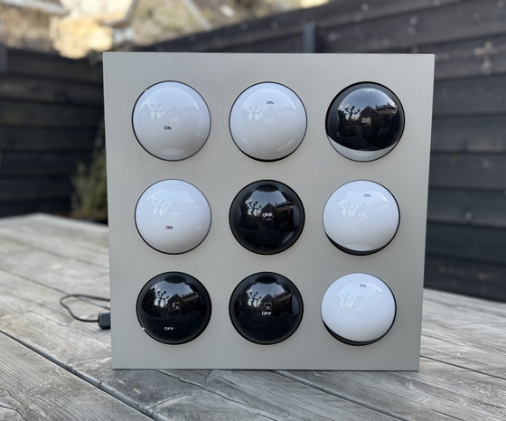 Ciò che rende questa lampada davvero speciale è il suo carattere cinetico. All'interno dell'elegante struttura in alluminio si trovano nove sfere rotanti, ognuna con un lato bianco e uno nero – "spento" e "acceso". Ruotandole, si può determinare il gioco di luci e il motivo luminoso. Ogni istante è diverso; si crea un'atmosfera sempre nuova, che spazia da un'estetica grafica ed elegante a una giocosa e dinamica.
