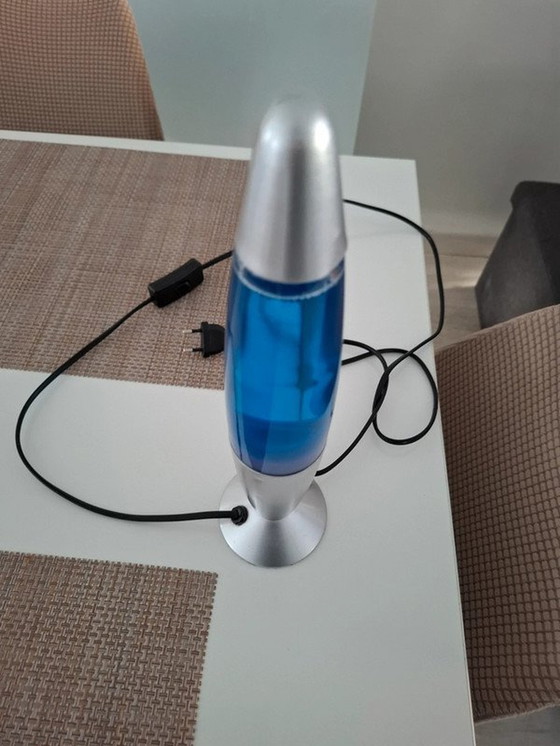 Lampada lava di colore blu. Funziona molto bene. Quando è fredda, impiega circa un'ora per muoversi all'interno, a causa del calore. È stata in soggiorno per molto tempo (senza fumo). Non troverete più questo modello in negozio. Altezza: 30 cm.
