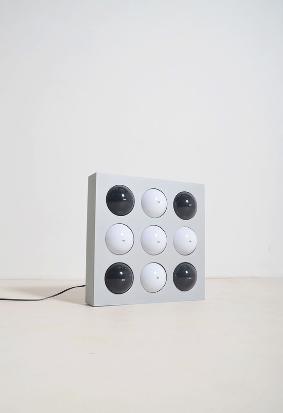 Un'esclusiva lampada Fifty Fifty disegnata dall'artista svizzero Paul Talman nel 1965 e prodotta da Interaktives Licht Köln. La lampada è composta da una struttura in alluminio contenente nove sfere di plastica con un lato "on" (bianco) e un lato "off" (nero). Ruotando le sfere si creano motivi diversi con giochi di luce diversi. Questa lampada può essere utilizzata come lampada da terra, da tavolo o da parete. Paul Talman era un pittore, scultore, grafico e designer svizzero. Nutriva un profondo interesse per il rapporto tra colore e movimento. Le sue opere sono state esposte in musei di tutto il mondo.