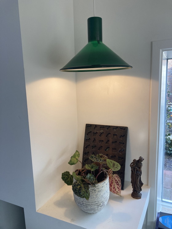 Illumina il tuo spazio con questa splendida lampada Holmegaard P&T! Il suo ricco paralume in vetro verde aggiunge un tocco di colore e un tocco di fascino vintage a qualsiasi stanza. Perfetta da appendere sopra un tavolo da pranzo o in un accogliente angolo lettura, questa lampada a sospensione è allo stesso tempo elegante e funzionale.