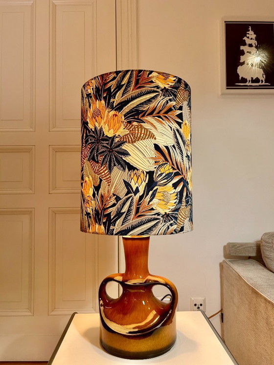 Lampada da tavolo Goebel in tipico design anni '60. Base vintage degli anni '60/'70, prodotta dalla rinomata manifattura di porcellane Goebel. Lampada da tavolo con manici, design di metà secolo, smalto ceramico marrone-rame lucido, WGP. Questa lampada è un oggetto da collezione di grande valore. Questa lampada da tavolo appartiene alla serie di ceramiche PAN, prodotta da Goebel in vari colori e forme e ancora oggi commercializzata a livello internazionale. È considerata un esempio di design tedesco di ceramiche e lampade di quell'epoca.