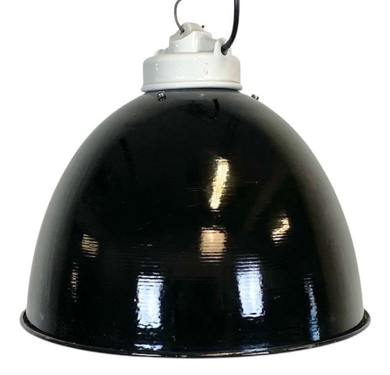 Lampada industriale in smalto nero con parte superiore in porcellana, anni '50