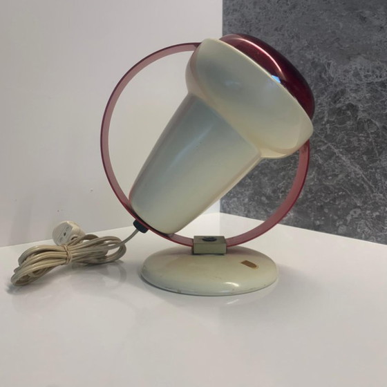 Il modello 7529 è una lampada da tavolo decorativa in alluminio laccato avorio e staffa rossa. L'angolo di inclinazione della lampada è regolabile. Può essere montata anche come lampada da parete.