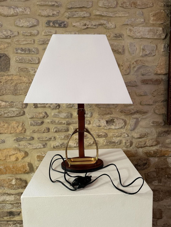Lampada da tavolo Jacques Adnet, modello "staffa", in cuoio cucito a punto sellaio e ottone, prodotta dalla rinomata azienda francese di pelletteria Longchamp. Questa lampada è nelle sue condizioni originali, con qualche segno del tempo qua e là; il paralume è stato sostituito con uno nuovo, che riproduce il design originale.