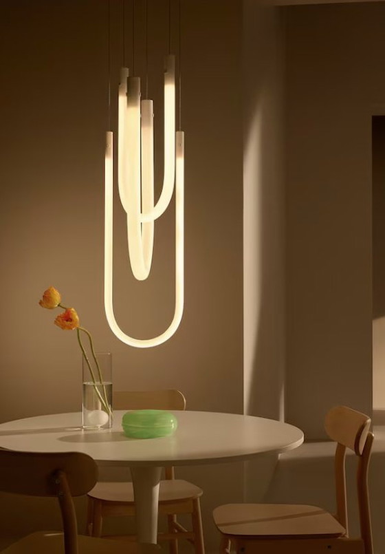 Questa lampada a sospensione decorativa in vetro smerigliato proietta una luce morbida e diffusa sul tavolo da pranzo. Le tre lampade sono facilmente regolabili in altezza per adattarsi a te e alla tua casa. La lampadina inclusa è resistente, ma se si rompe o smette di funzionare, puoi semplicemente sostituirla con una nuova. Una lampadina a LED non solo dura 20 volte di più di una lampadina a incandescenza standard, ma consuma anche l'85% di energia in meno. Nuova, ancora nella scatola! Diametro: 46 cm Flusso luminoso: 780 lumen Potenza: 10,5 W Durata stimata: 25.000 ore Altezza minima: 72 cm Altezza massima: 160 cm