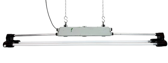 Questa lampada industriale in alluminio pressofuso e bachelite è stata prodotta da Elektrosvit negli anni '70 nell'ex Cecoslovacchia. Questi apparecchi venivano utilizzati in laboratori e impianti chimici e industriali. La lampada richiede due tubi LED T8 da 150 cm. Il peso della lampada è di 6 kg. I tubi LED e la catena non sono inclusi.