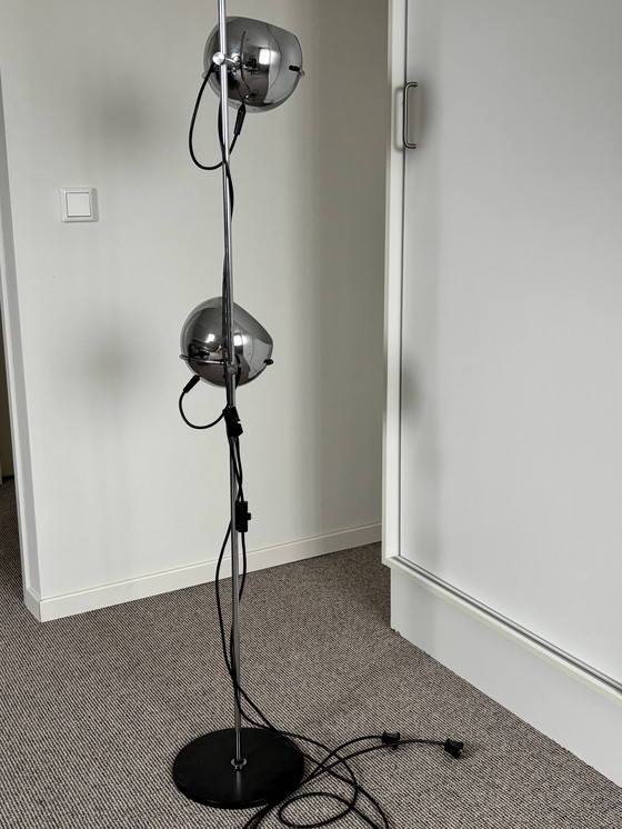 Cromata con base nera. I globi poggiano liberamente su aste, consentendone la rotazione in qualsiasi direzione. La lampada risale agli anni '60/'70 e proviene dal primo proprietario. In ottime condizioni, con qualche piccolo segno di usura.