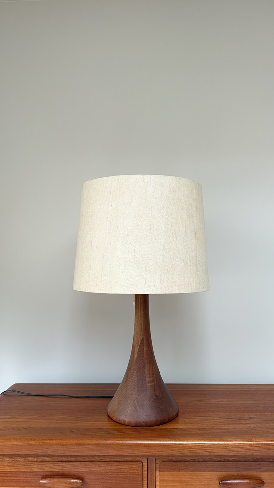 Lampada vintage Domus in teak degli anni '70. La lampada ha una base curva in teak massello con paralume in tessuto beige appoggiato su una base in plastica. Può contenere tre lampadine. La lampada si aziona tramite un interruttore a tirante. Sono possibili tre diverse impostazioni di luce, a seconda che si aziona l'interruttore una, due o tre volte. Dimensioni: 45Ø x 75H cm. Base: 23Ø cm. Ritiro possibile solo a Maastricht o consegna su richiesta.