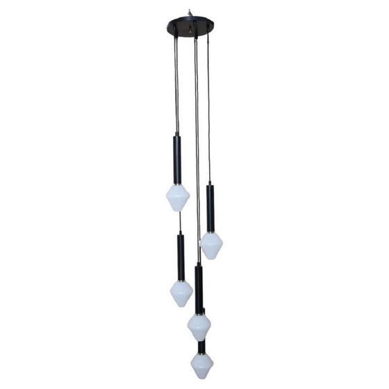 Questo splendido lampadario presenta un caratteristico design a cascata, realizzato in Italia negli anni '60 o '70. Il suo elegante effetto cascata presenta cinque livelli, realizzati con una struttura in metallo laccato nero, completata da dettagli in ottone dorato e delicati paralumi in vetro satinato bianco. Pur traendo ispirazione dal famoso designer Tapio Wirkkala, questo lampadario non riporta alcun marchio di produzione. Ciononostante, la sua fattura artigianale e il suo straordinario impatto visivo sono davvero notevoli, rendendolo un'aggiunta accattivante a qualsiasi spazio. Ideale per valorizzare interni sia moderni che vintage, questo lampadario illumina una stanza con le sue cinque lampadine, creando un'atmosfera calda e accogliente. È in buone condizioni, essendo stato ricablato per garantirne sicurezza e funzionalità. Questo pezzo promette di essere un punto focale mozzafiato in qualsiasi casa.