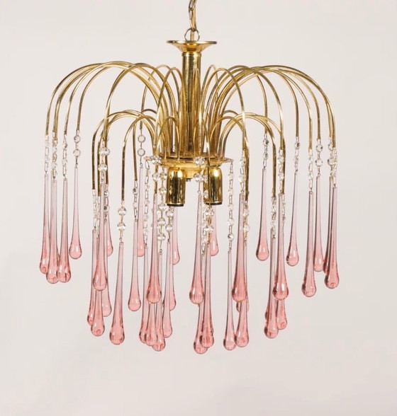 Illumina il tuo spazio con la squisita eleganza di questo lampadario a goccia in vetro di Murano degli anni '70. Questo splendido pezzo cattura l'essenza del design italiano vintage, con delicate gocce in vetro di Murano rosa che scendono con grazia da una montatura in ottone dorato. L'esclusivo design a goccia del lampadario aggiunge un tocco di raffinatezza e fascino, rendendolo un elemento centrale perfetto per qualsiasi stanza.