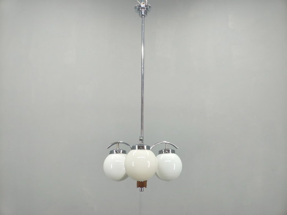 Elegante lampadario Art Déco prodotto in Cecoslovacchia negli anni '30, caratterizzato da una sofisticata combinazione di metallo cromato, caldi dettagli in legno di noce e tre paralumi a globo in vetro opalino.