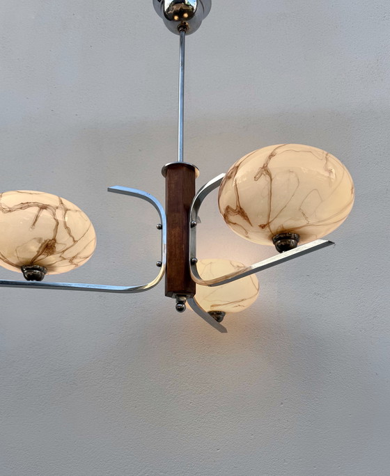 Splendido lampadario in stile Art Déco (anni '40) composto da tre bracci in metallo cromato convergenti su una base centrale in legno di teak con globi in vetro opalino marmorizzato; ottime condizioni generali (bella patina); monta tre lampadine a baionetta.