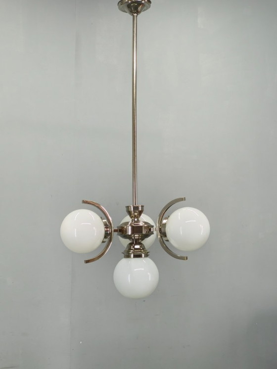 Questo raffinato apparecchio di illuminazione presenta una struttura in metallo nichelato abbinata a quattro paralumi a globo in vetro lattiginoso. La composizione geometrica equilibrata e i bracci curvi scultorei incarnano l'eleganza e la chiarezza architettonica del movimento Art Déco.