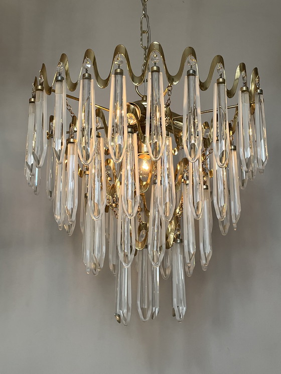Che splendida lampada a sospensione di grandi dimensioni, la più bella che abbia mai visto! È piena di splendidi ghiaccioli sfaccettati in vetro di Murano soffiato a mano, ispirati all'Art Déco, che, abbinati alla cornice curva in oro, catturano davvero l'attenzione! I grandi e splendidi ghiaccioli soffiati a mano pendono da splendide perle di cristallo autentico. Un vero gioiello vintage di Hollywood. In splendide condizioni e completa. Le misure sono: Larghezza 50 cm, Altezza 55 cm senza catena e piastra di fissaggio al soffitto. Altezza misurata con catena, la catena da 155 cm può essere accorciata. Preferisci la spedizione? È possibile! Naturalmente saranno ben imballati 😀 #paolovenini #vintage #hollywoodstyle #artnouveau #jugendstil #italian #homedecor #pendantlamp #vintageforsale #vtwonenbijmijthuis #interiorinspiration #crystal #vintageitems #homedecor #instaverkoop #livingroominspiration #camera da lettoinspiration #interiorstyling #vintagefurniture #hollywoodregency #interior #interiordesign #boho #eclecticliving #vintagepearls #teardropchandelier