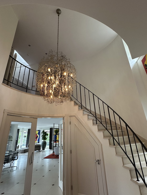 Un bellissimo e grande lampadario del marchio Van Egmond. Questo pezzo di design unico è un vero e proprio colpo d'occhio per qualsiasi interno. Il lampadario verrà smontato da un professionista il 24 febbraio e sarà disponibile per il ritiro. Le dimensioni si riferiscono al lampadario, esclusa la catena (inclusa).