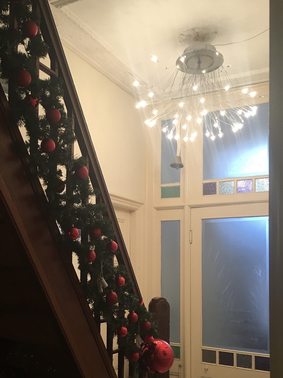 Grande lampadario in metallo regolabile con 48 lampadine alogene. Fornisce molta luce.