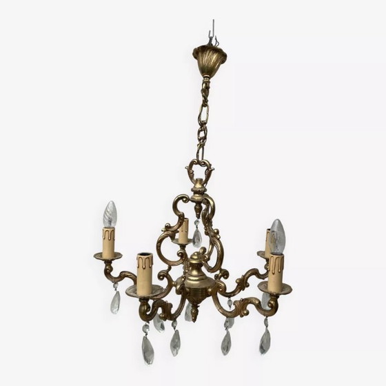 Lampadario in ottone a 5 bracci in stile Luigi XV con gocce di cristallo