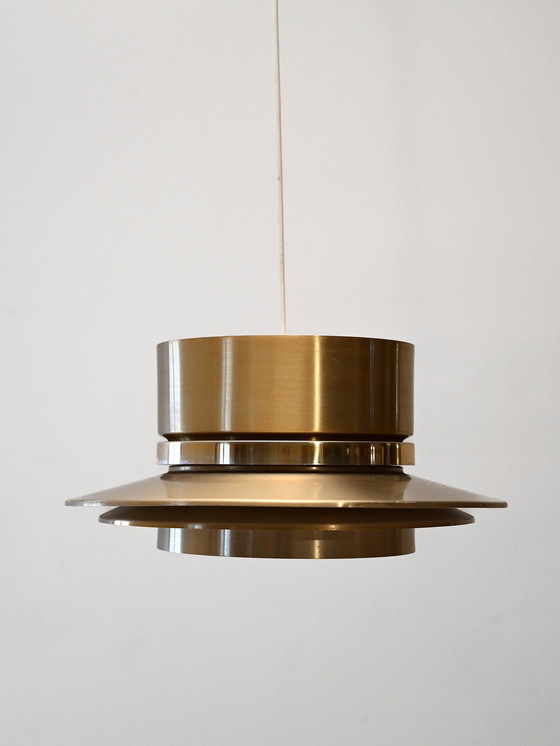 Lampadario in ottone disegnato da Carl Thore per Granhaga negli anni '60, caratterizzato da un design geometrico essenziale. I due strati sovrapposti creano un effetto di luce morbida e diffusa, mentre il metallo lucido aggiunge eleganza e minimalismo allo spazio. Un pezzo iconico del design scandinavo che unisce funzionalità e stile.