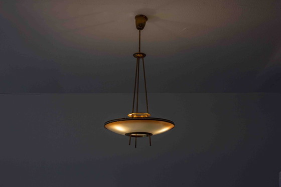 Raro lampadario disegnato da Pietro Chiesa per Fontana Arte negli anni '50. Questa versione presenta un diffusore in vetro opalino a mezza cupola sospeso a tre aste in ottone con eleganti dettagli strutturali. Originariamente concepito come una cupola completa, questo pezzo è privo della sezione superiore in vetro, ma funziona perfettamente e conserva il suo equilibrio visivo e la sua atmosfera.