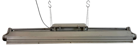 Questa lampada tubolare industriale è stata prodotta da Polam Gdansk in Polonia negli anni '70. Presenta un corpo in alluminio e un paralume in ferro verniciato grigio martellato. La lampada è convertita in tre tubi luminosi a LED T8 da 120 cm. Il peso della lampada è di 7 kg. I tubi luminosi non sono inclusi.