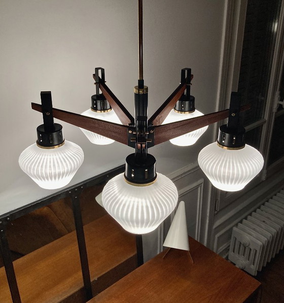 Lampadario italiano vintage a 5 luci in teak, ottone e vetro opalino, in stile modernista scandinavo, in ottime condizioni.