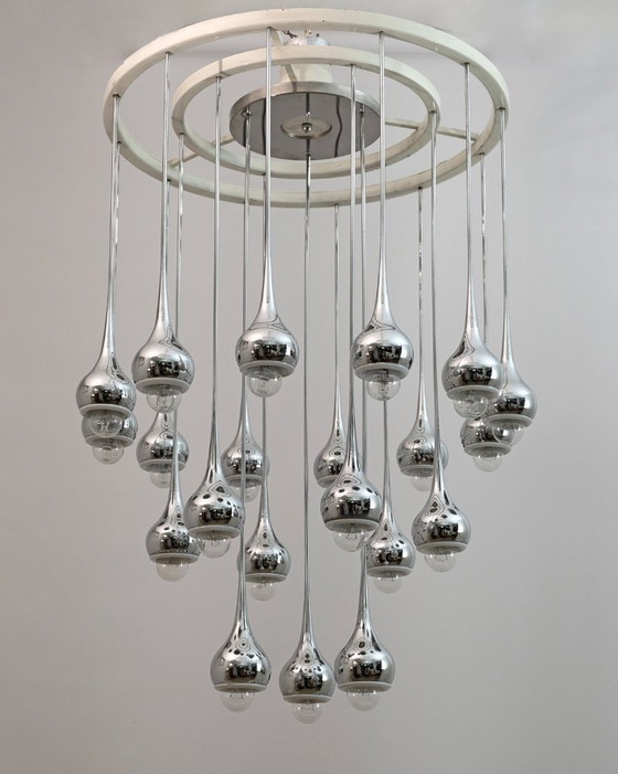 Un sorprendente lampadario Esperia, 21 pendenti in metallo cromato che raffigurano gocce d'acqua che cadono dal soffitto.