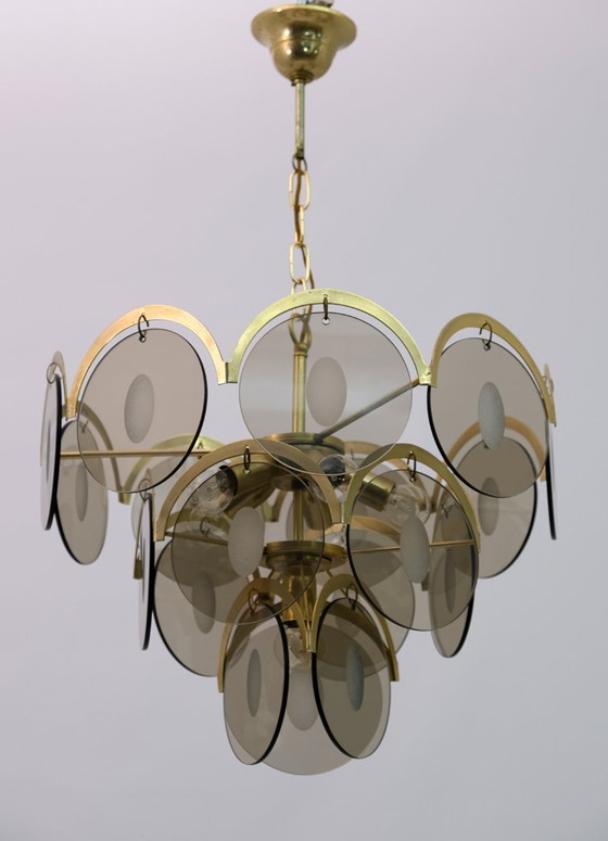 Questo lampadario a 6 luci, struttura in metallo dorato con 18 dischi dal diametro di 14,5 cm, i dischi sono stati realizzati in vetro bronzato fumé e molatura centrale.