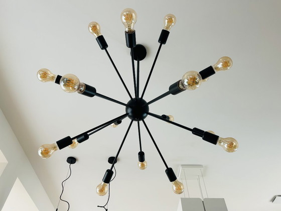 Splendido lampadario nero con 20 lampadine bianco caldo, vendute separatamente. Elegante e raffinata, questa plafoniera ha un diametro e un'altezza di 1 metro. È smontabile.