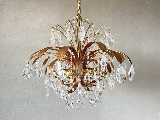 Questo splendido lampadario vintage Palwa aggiunge un tocco di eleganza a qualsiasi ambiente. Con i suoi cristalli scintillanti e la finitura in metallo dorato, cattura la luce in modo accattivante. Perfetto per interni classici o moderni. In eccellenti condizioni vintage.