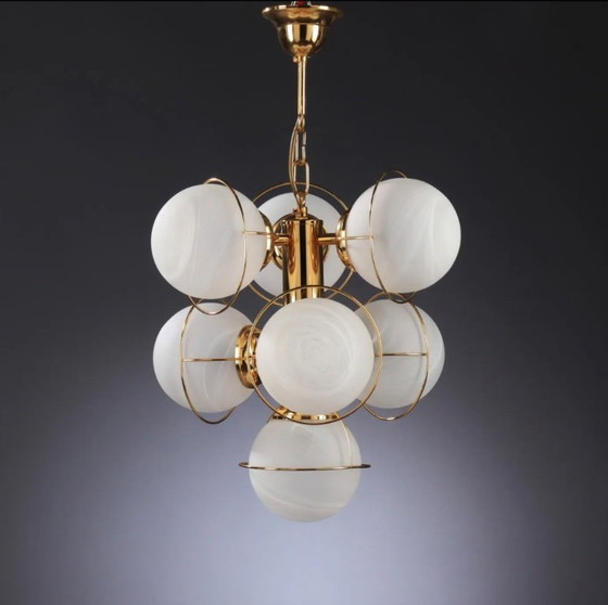 Questo lampadario italiano Sputnik degli anni '80 è un pezzo straordinario che incarna l'eleganza e lo stile della sua epoca. Caratterizzato da una sorprendente combinazione di metallo dorato e vetro bianco, presenta un design unico con molteplici paralumi in vetro sferici disposti a forma di sputnik. Il lampadario è perfetto per aggiungere un tocco di fascino vintage a qualsiasi ambiente, rendendolo un pezzo forte sia negli interni moderni che in quelli classici.