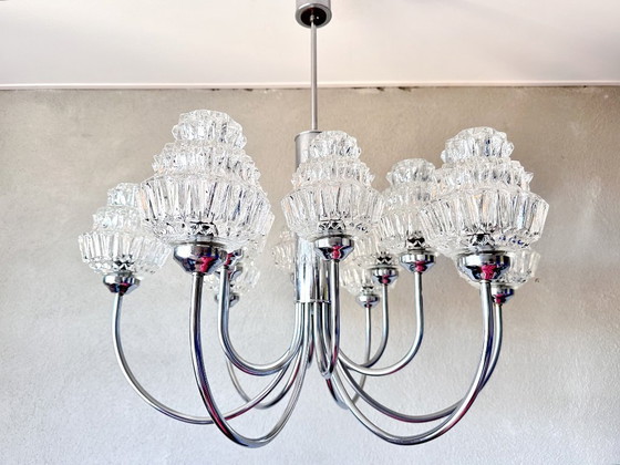 Questo lampadario vintage emana eleganza grazie ai suoi splendidi dettagli in vetro e alla finitura in metallo color argento. Perfetto per aggiungere un tocco di fascino classico a qualsiasi ambiente. Il lampadario è in ottime condizioni e pronto a illuminare i vostri interni.